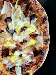Red based Hawaiian-style pizza topped with Nueske's applewood smoked bacon, sliced ham, fresh mozzarella, pineapple and Parmesan cheese...
